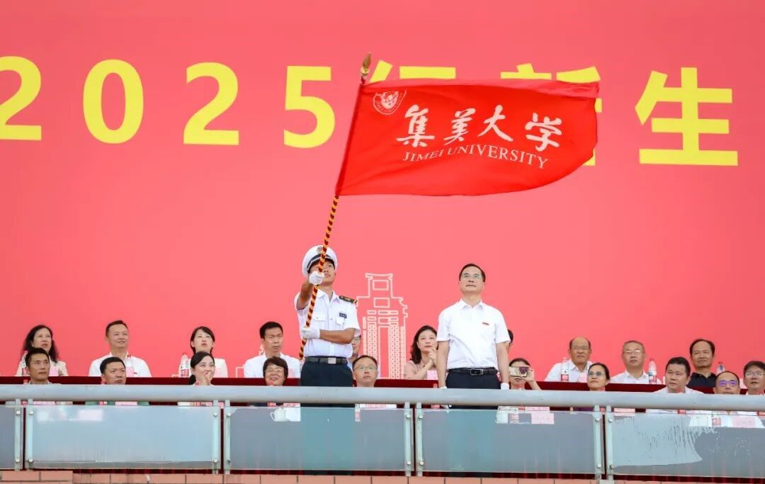 校党委书记邱伟杰向2025级新生代表授予亚洲中文精品乱码校旗。校领导为2025级新生代表佩戴校徽,赠送《习近平与大学生朋友们》与《陈嘉庚精神读本》。